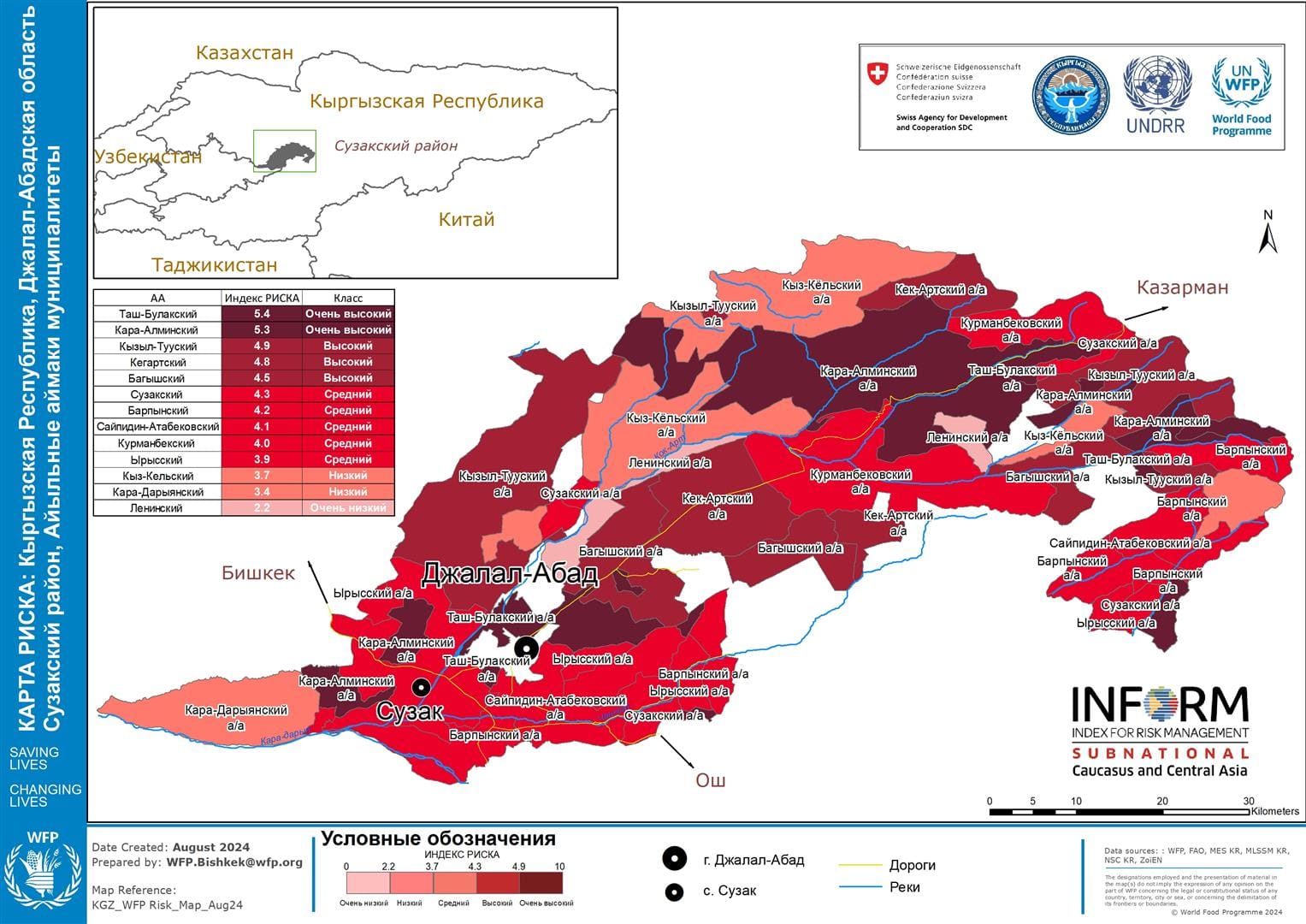 Министерство чрезвычайных ситуаций КР совместно со Всемирной продовольственной программой ООН (ВПП) и при поддержке правительства Швейцарии провели пилотное внедрение модели INFORM — инструмента оценки риска стихийных бедствий — на уровне Сузакского района Джалал-Абадской области. Об этом сообщили в ВПП.