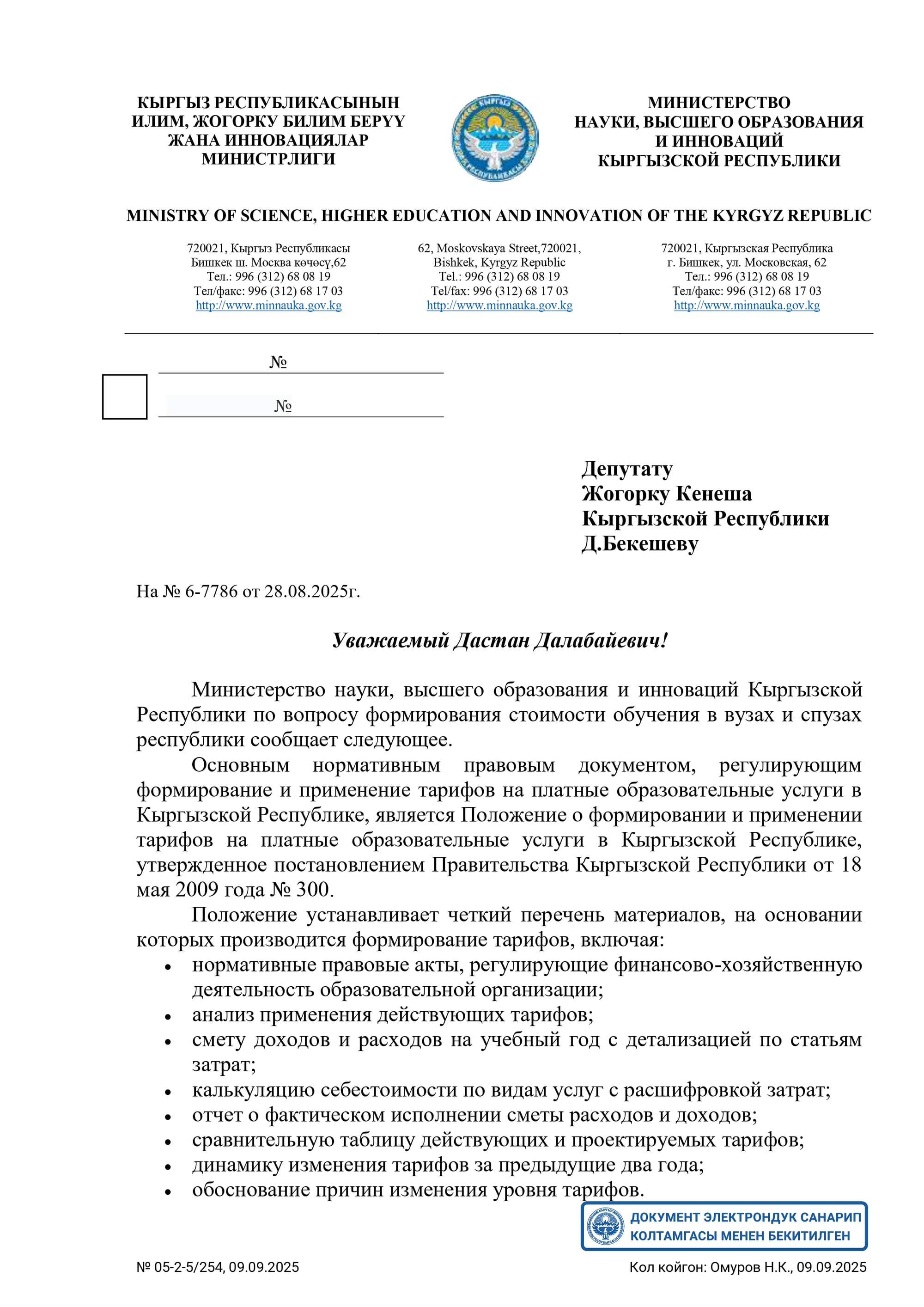 Депутат Жогорку Кенеша Дастан Бекешев обратился в Министерство науки, высшего образования и инноваций КР с предложением обязать частные детские сады, школы, вузы и другие образовательные организации публиковать цены на обучение и обосновывать их структуру.
