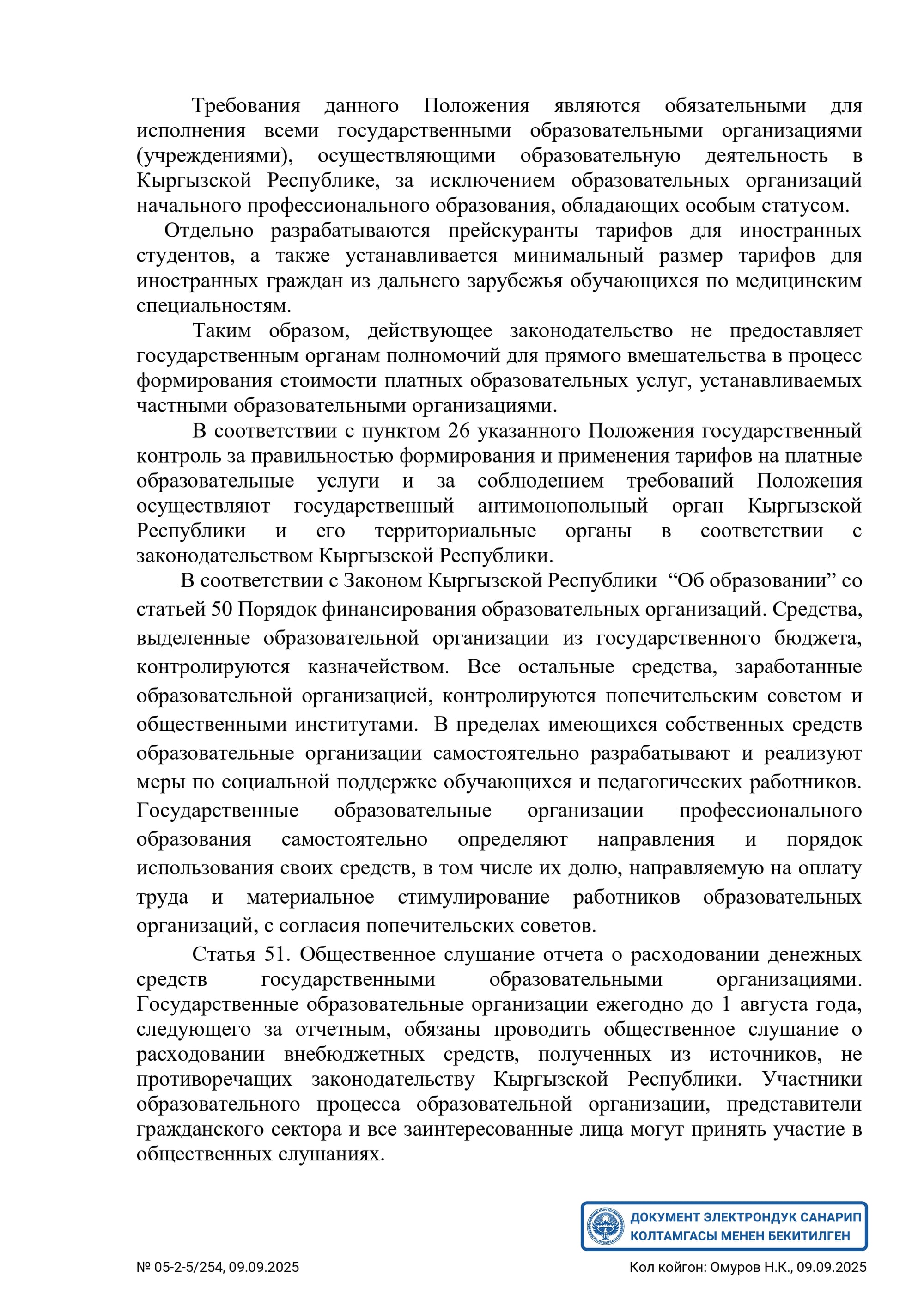 «Действующее законодательство не предоставляет государственным органам полномочий для прямого вмешательства в процесс формирования стоимости платных образовательных услуг, устанавливаемых частными образовательными организациями», — говорится в документе, подписанном замминистра Нурланом Омуровым.