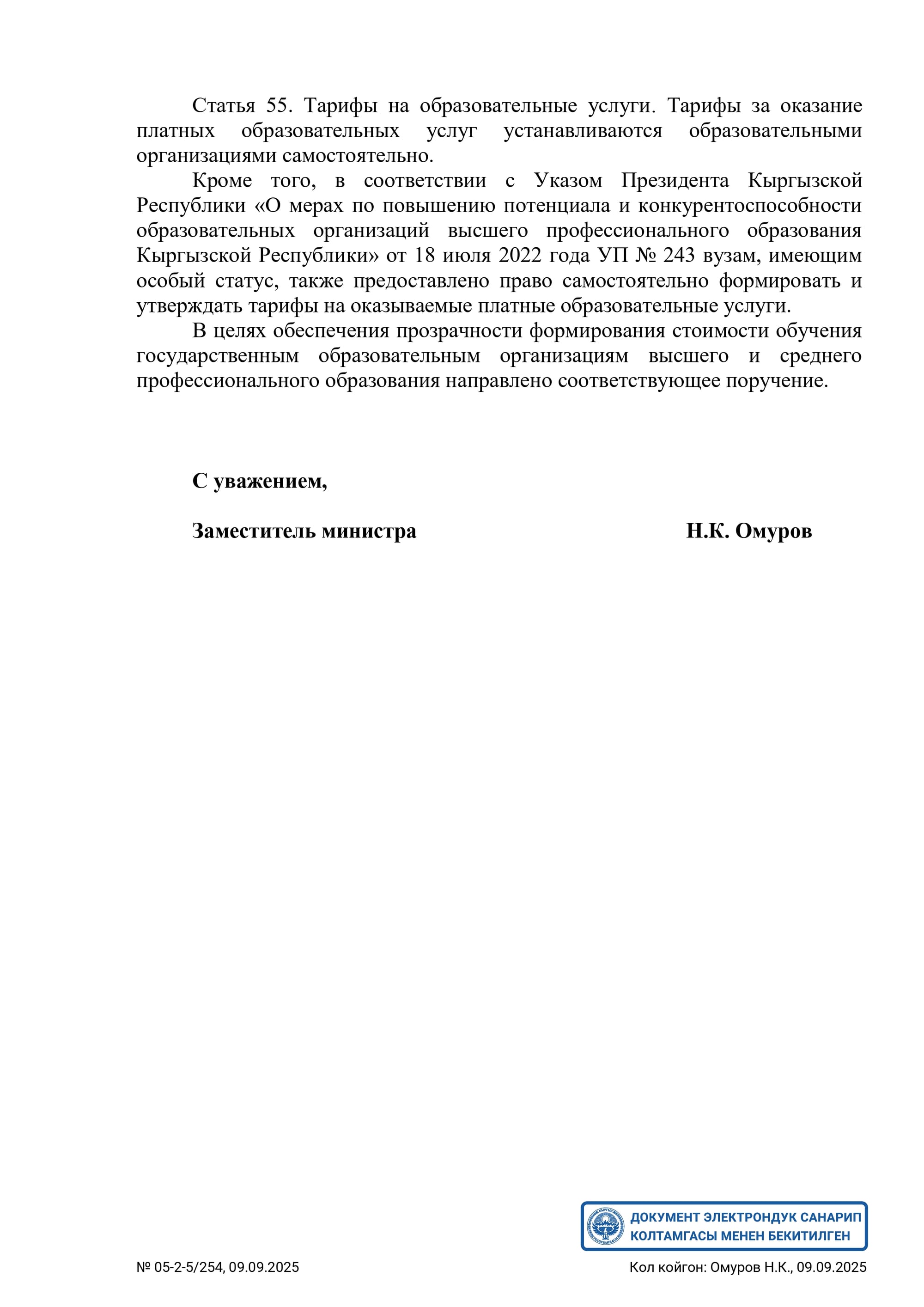 В министерстве также напомнили, что согласно Указу президента КР от 18 июля 2022 года №243, вузам с особым статусом предоставлено право самостоятельно утверждать тарифы на обучение.