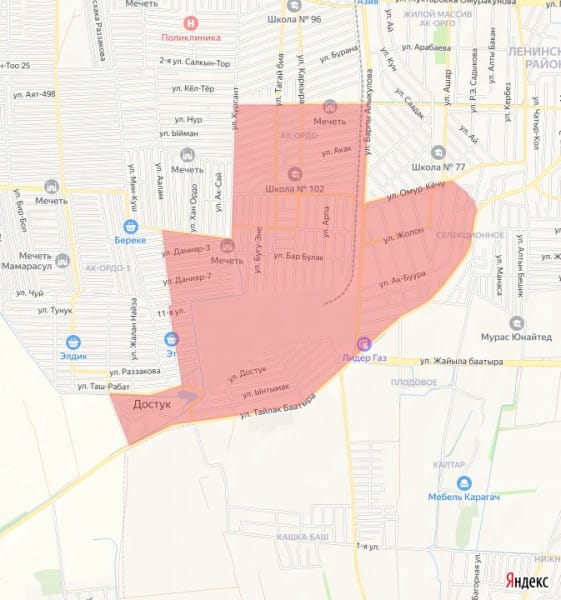 Без воды останутся жилые дома, школы, детсады, медучреждения и другие объекты в районе, ограниченном улицами: с. Достук – ж/м ТЭЦ-2 – ул. Ынтымак – ул. Кок-Асаба – ул. Кок-Жайык – ул. И. Ахунбаева – ул. Б. Алыкулова – ул. Омур – ул. Муромская – ул. Селекционная – трасса Кунтуу.