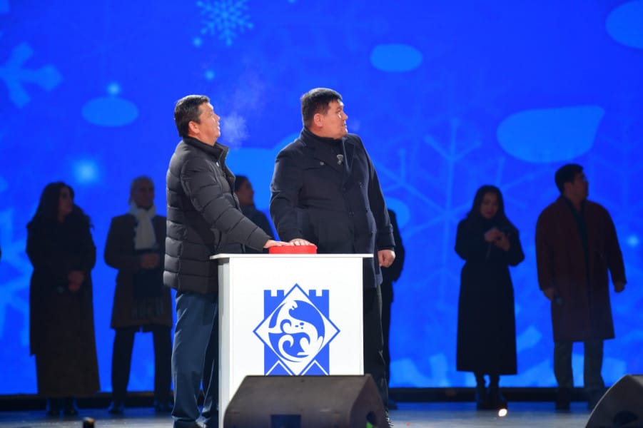 Церемония зажжения огней главной новогодней елки на площади Ала-Тоо в Бишкеке 15 декабря 2025 года. Фото: мэрия.