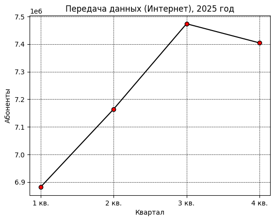Активных пользователей услуг передачи данных к концу года насчитывалось 7.4 млн против 6.88 млн в первом квартале. Во втором квартале показатель составлял 7.16 млн, в третьем — 7.47 млн. За год интернет-сегмент вырос на 522.6 тысячи абонентов.