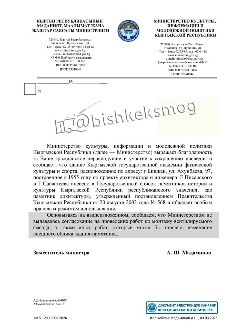 Министерство культуры Кыргызстана официально подтвердило, что не выдавало разрешение на монтаж вентилируемого фасада на здании Кыргызской государственной академии физической культуры и спорта. Об этом сообщили активисты общественного объединения «БишкекСмог».