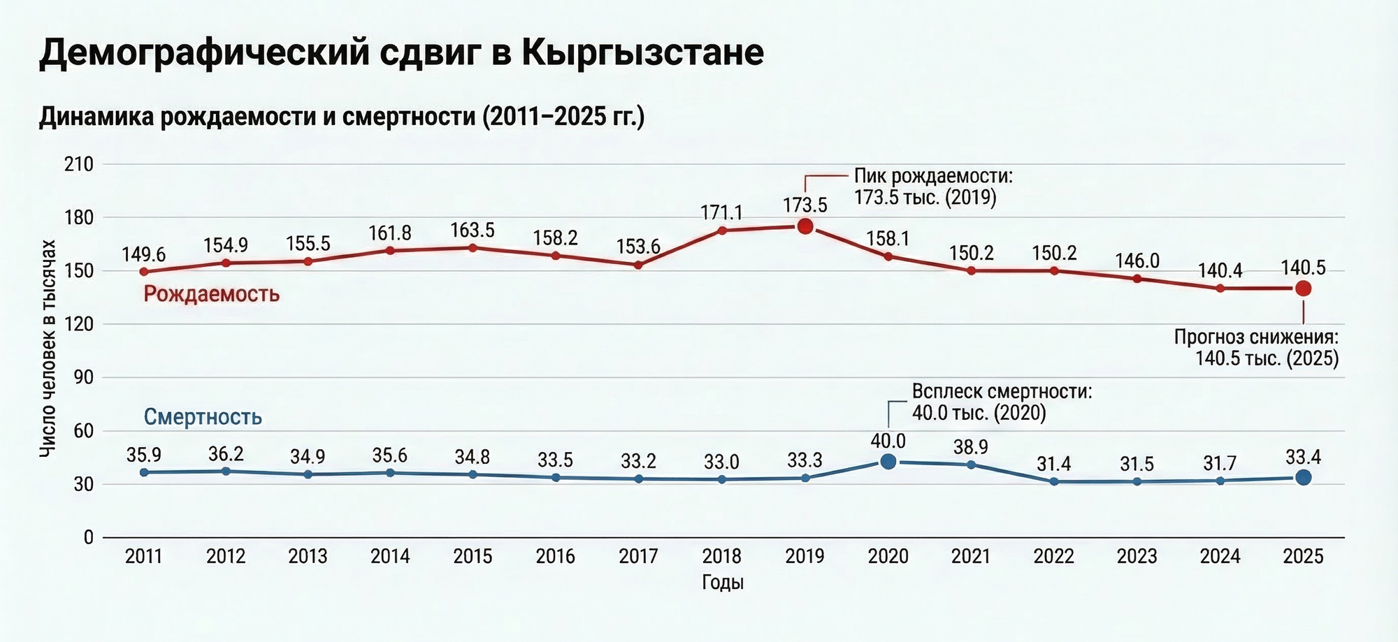 Кыргызстан завершил 2025 год с показателями рождаемости, которые фактически вернулись на уровень начала 2010-х. Снижение числа новорожденных при стабильной смертности сигнализирует о завершении периода демографического роста и формирует долгосрочные вызовы для экономики.