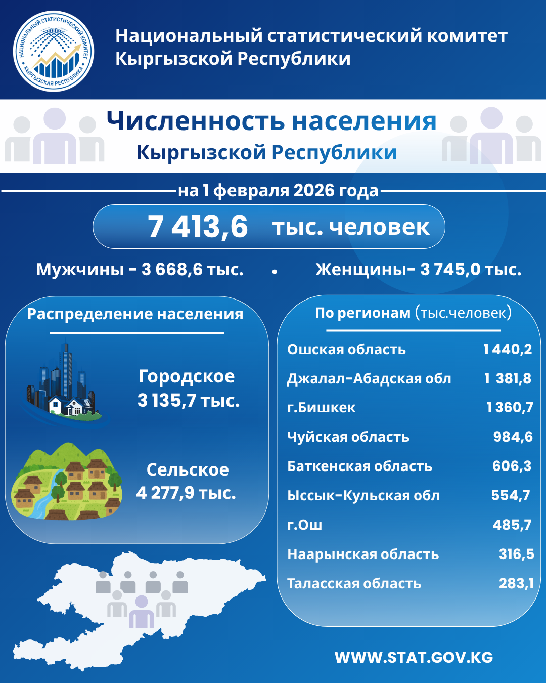Самым населенным регионом остается Ошская область, где на начало февраля проживали 1 млн 440.2 тысячи человек. Далее идут Джалал-Абадская область с 1 млн 381.8 тысячи жителей и Бишкек, где численность населения достигла 1 млн 360.7 тысячи человек.