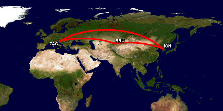 Перелет из Сеула в загреб включает промежуточную посадку в Бишкеке – для дозаправки. Обратные рейсы из Загреба в Сеул будут выполняться без посадок. Выйти из самолета или подняться на борт на этом рейсе, скорее всего не получится: ни на участке Сеул – Бишкек, ни перед вылетом из Кыргызстана в Загреб.
