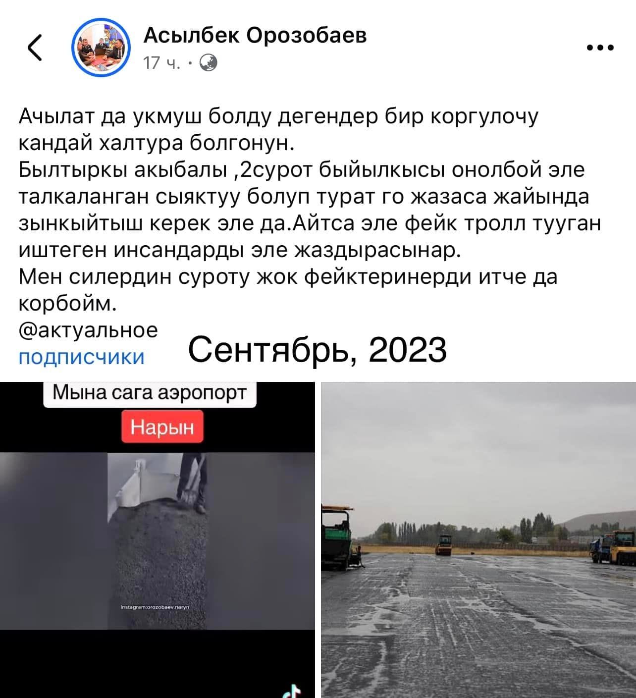 В ответ на публикацию в социальных сетях пользователя под ником Асылбек Орозбаев, в которой утверждалось о ненадлежащем ремонте, компания заявила, что эти сведения не соответствуют действительности.