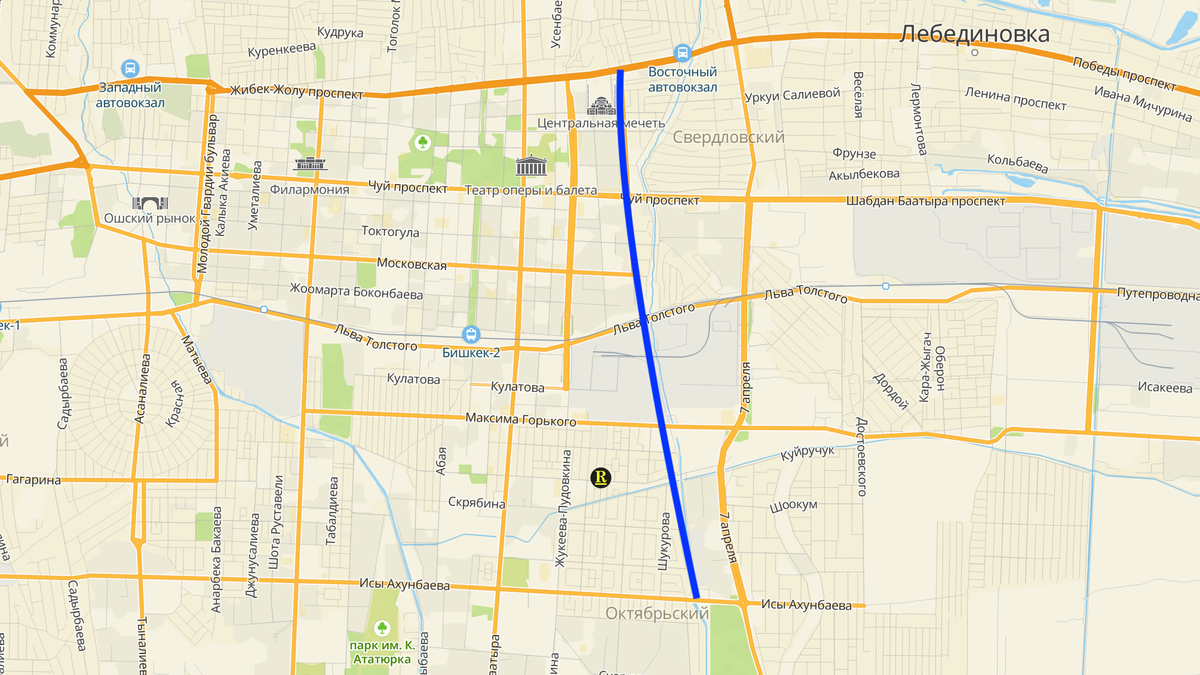 Новая магистральная дорога, соединяющая улицу Ахунбаева и проспект Жибек-Жолу, будет проложена вдоль берега реки Аламедин, продолжая движение на север по улице Шукурова, где строится мост, и через улицу Медерова выйдет на улицу Льва Толстого, далее пересечет железную дорогу и будет соединена с улицей Суюнбаева.