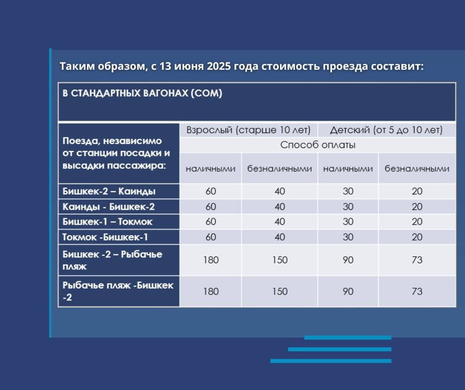 Например, поездка от станций Каинды, Сокулук или Кант до Бишкека обойдется в 40 сомов при безналичной оплате и 60 сомов — при оплате наличными. Ранее тарифы на этих направлениях варьировались от 20 до 56 сомов.