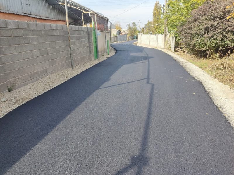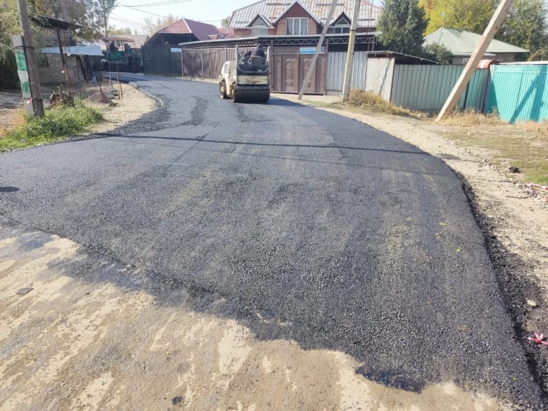 Работы выполняет подрядная организация ОсОО «Сапат Геодезия». Ранее на этом участке для временного улучшения покрытия проводилась засыпка щебнем.