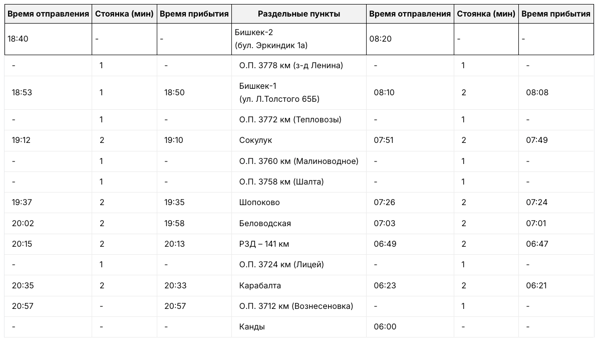 - отправление из Каинды: 06:00, прибытие в Бишкек-2: 08:20;