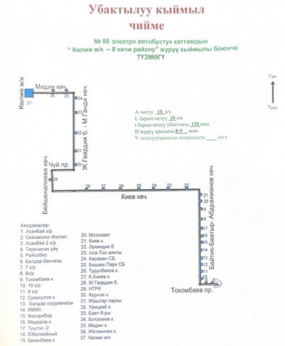 Электробусы будут курсировать по следующему направлению: Көлмө — ул. Мидин — ул. Махатмы Ганди — бульвар Молодой Гвардии — проспект Чуй — ул. Бейшеналиева — ул. Киевская — проспект Байтик Баатыра — проспект Токомбаева — 8-й микрорайон.