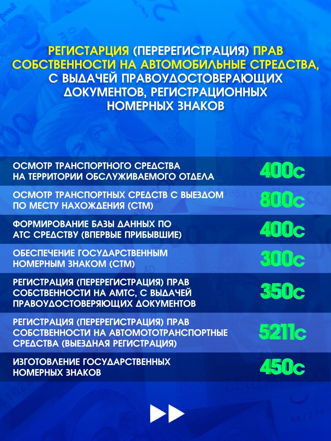 Обеспечение государственным номерным знаком для транспортного средства обходится в 300 сомов, регистрация или перерегистрация прав собственности на автомототранспортные средства с выдачей правоустанавливающих документов — 350 сомов. Выездная регистрация прав собственности на автомототранспортные средства стоит 5 211 сомов, изготовление государственных номерных знаков — 450 сомов.