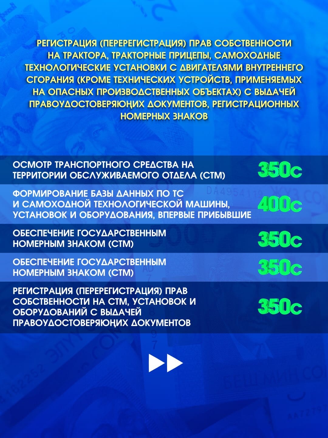 Отдельный блок тарифов касается тракторов, тракторных прицепов и самоходных технологических установок с двигателями внутреннего сгорания. Осмотр такой техники на территории отдела стоит 350 сомов, формирование базы данных по транспортному средству и оборудованию — 400 сомов. Обеспечение государственными номерными знаками для самоходной техники оценивается в 350 сомов, столько же стоит регистрация или перерегистрация прав собственности с выдачей правоустанавливающих документов.