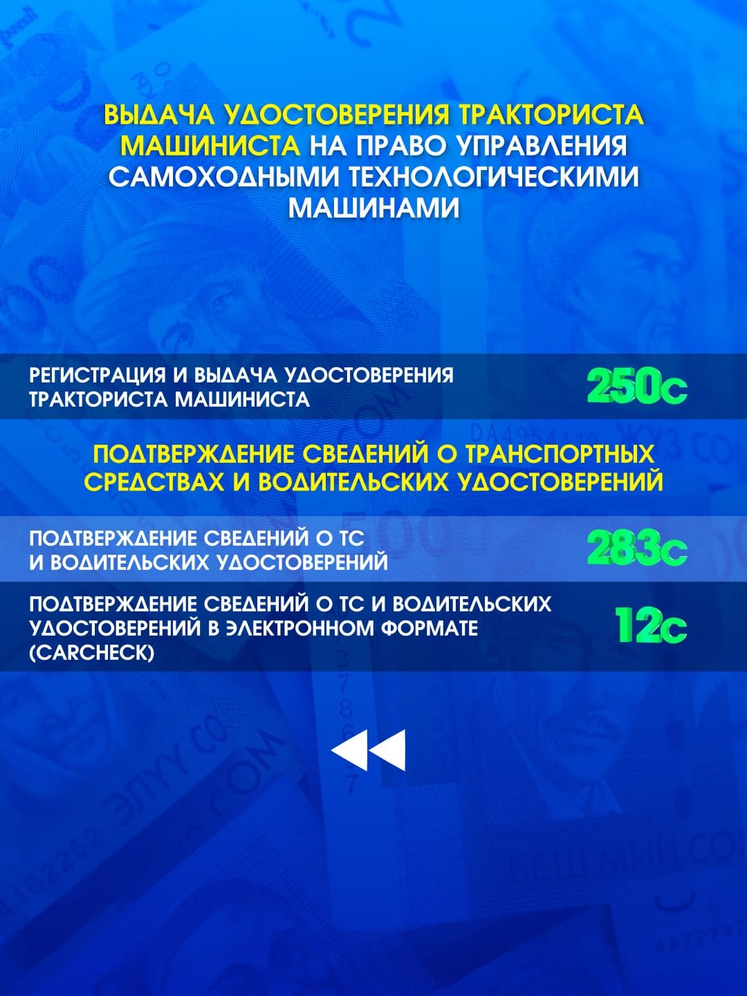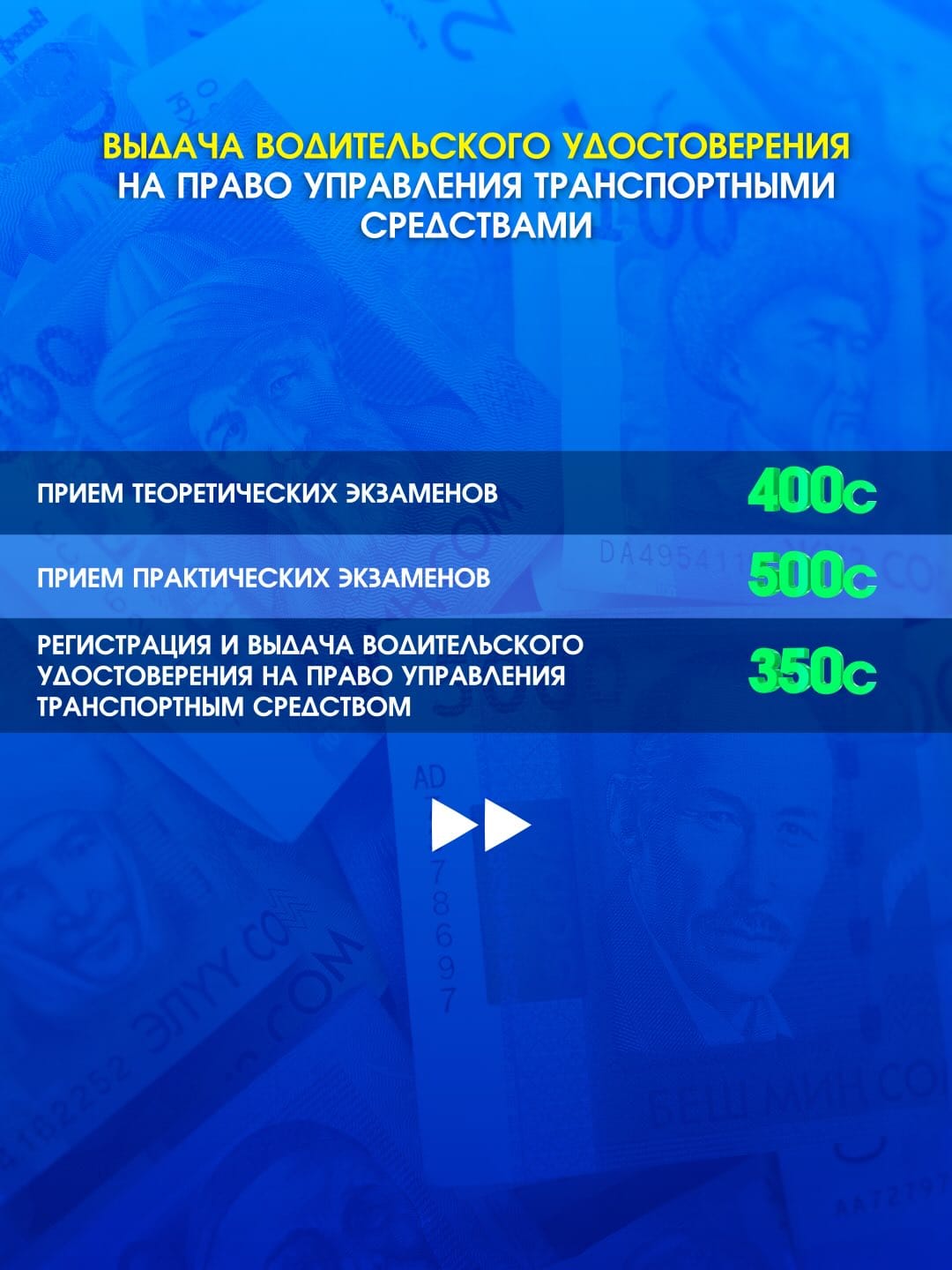 За прием теоретического экзамена на право управления транспортными средствами предусмотрена оплата в размере 400 сомов, за практический экзамен — 500 сомов. Регистрация и выдача водительского удостоверения стоят 350 сомов. Регистрация и выдача удостоверения тракториста машиниста оцениваются в 250 сомов. Подтверждение сведений о транспортных средствах и водительских удостоверениях стоит 283 сома, а подтверждение этих сведений в электронном формате — 12 сомов.