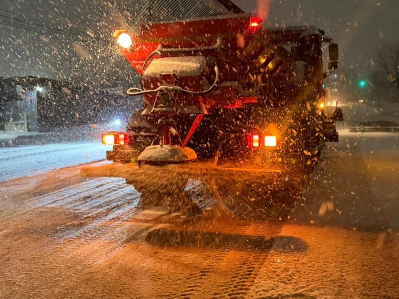 Спецмашины уже провели первую противогололедную обработку и продолжают расчистку основных магистралей. Дорожные рабочие очищают тротуары, остановки и общественные пространства.