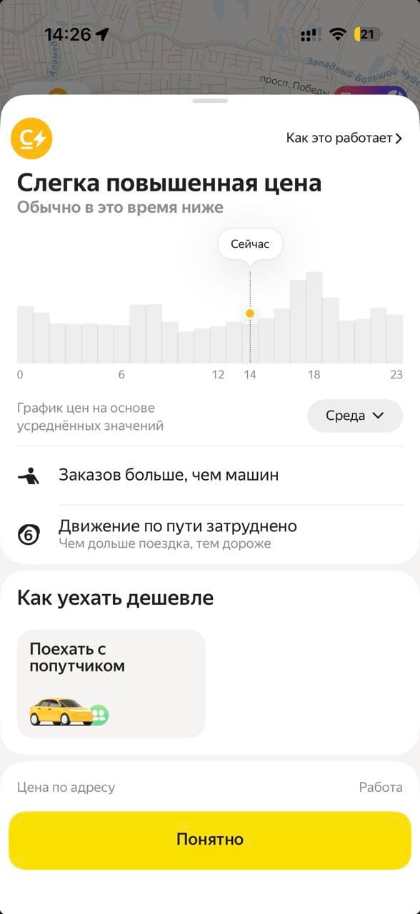 Найти индикатор спроса можно в верхнем левом углу на главном экране приложения. При нажатии на индикатор спроса можно увидеть график цен на основе усредненных значений, дорожные условия, а также информацию об уровне спроса.