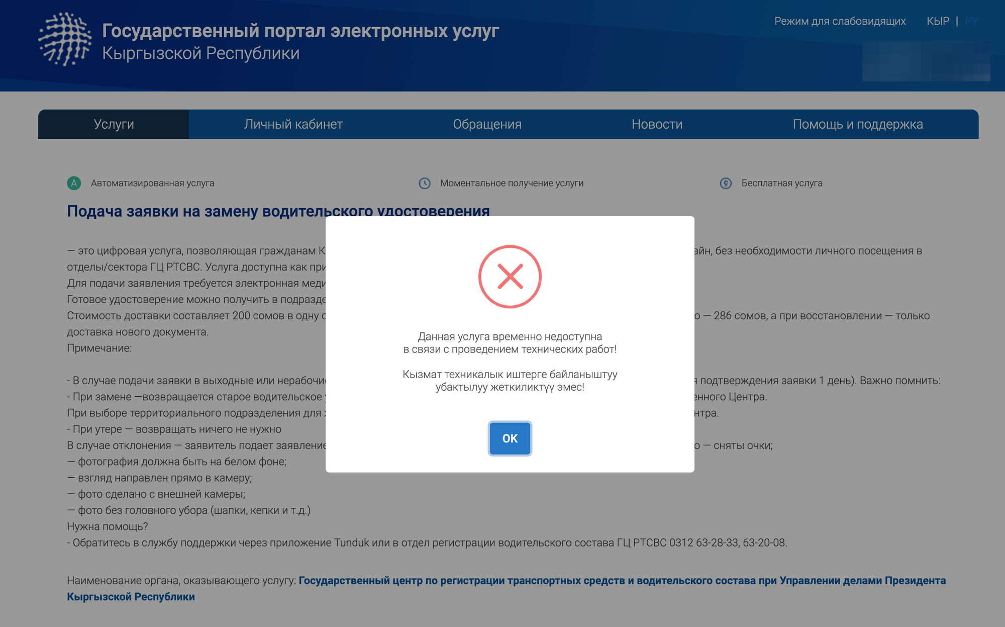 Подача заявок на замену водительских удостоверений через государственный портал электронных услуг «Тундук» временно недоступна из-за технических работ, следует из информации на сервисе.