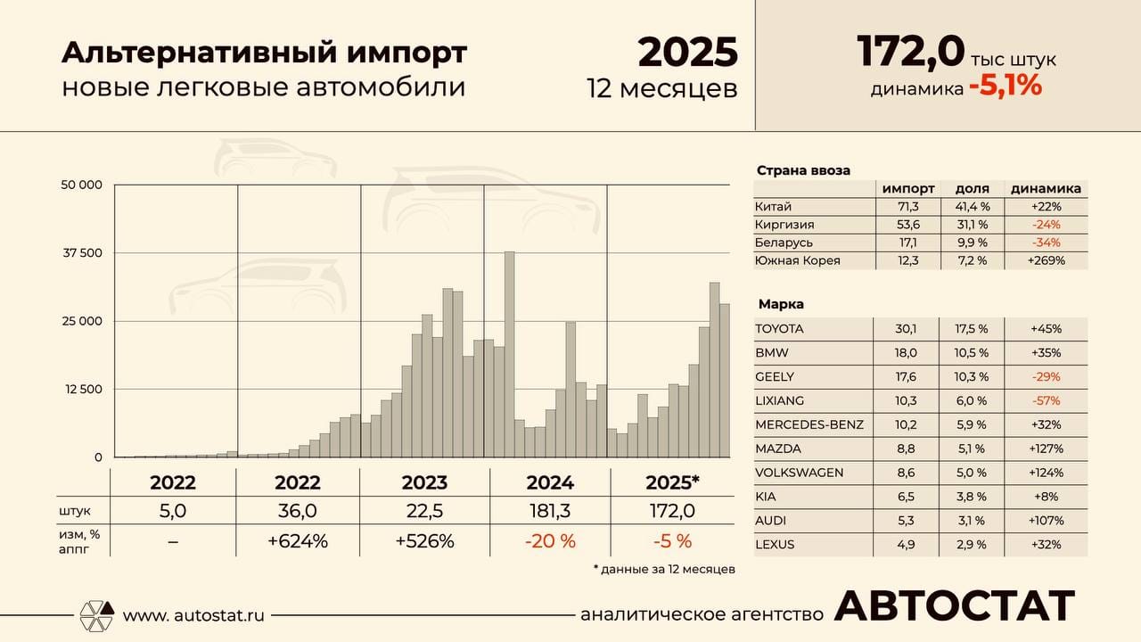 В марочной структуре альтернативного импорта лидирует Toyota — за год ввезли чуть более 30 тысяч автомобилей, что на 45% больше, чем годом ранее. Второе место занимает BMW с объемом 18 тысяч автомобилей (плюс 35%). Ввоз Geely снизился на 29%, но объем остался высоким — 17.6 тысячи автомобилей, и это, по оценке автора, поддержало позиции бренда в продажах.