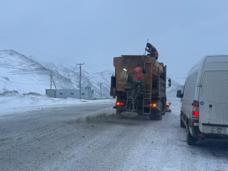 По данным ведомства, госпредприятия «Кыргызавтожол-Север» и «Кыргызавтожол-Юг» проводят очистку проезжей части и подсыпку скользких участков песчано-соляной смесью.