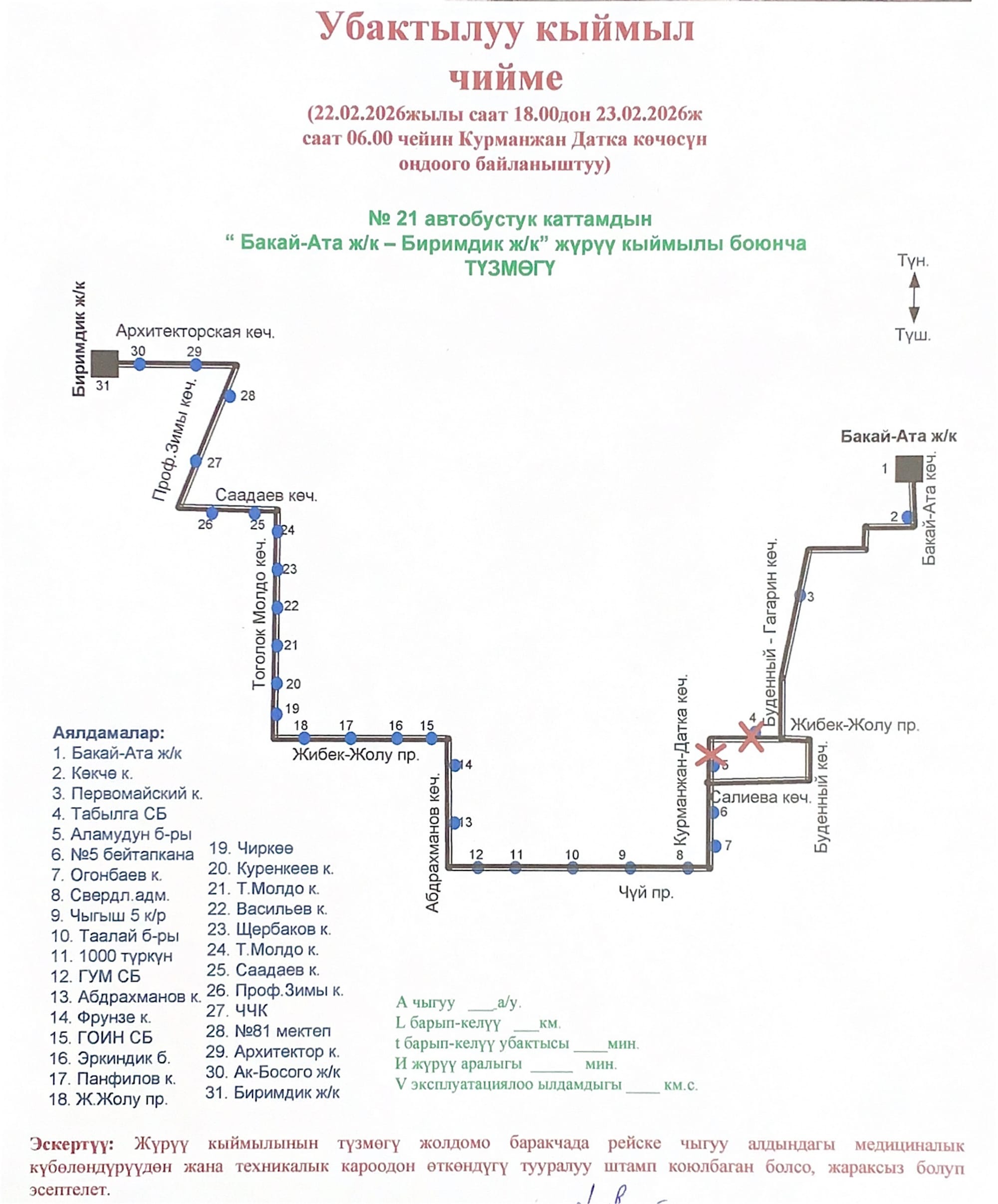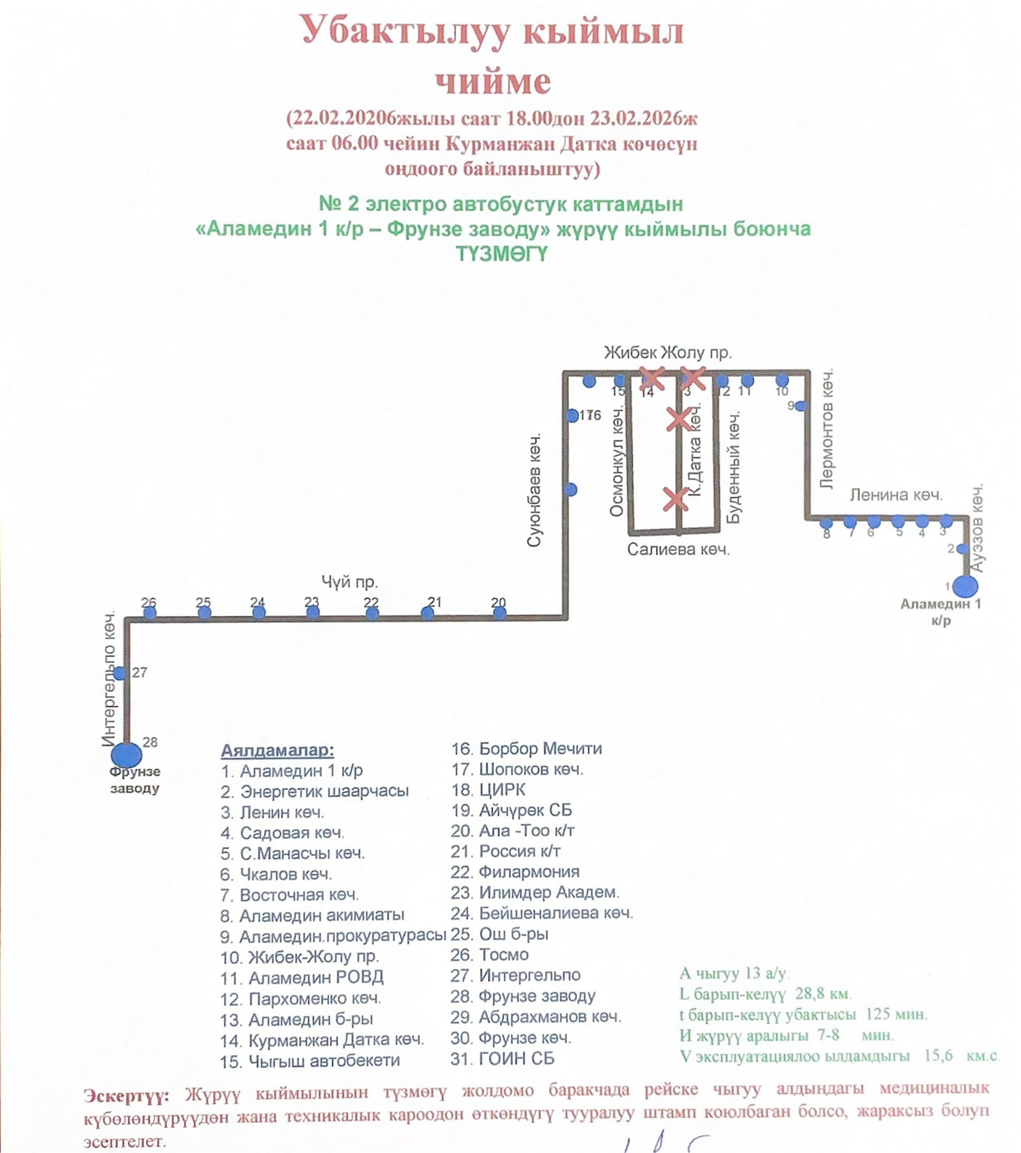 В Бишкеке 22 февраля с 18:00 до 06:00 утра 23 февраля закроют движение на участке проспекта Жибек-Жолу — от улицы Буденного до улицы Курманжан Датки. В мэрии столицы подчеркнули, что ограничения связаны с монтажом металлоконструкций надземного пешеходного перехода.