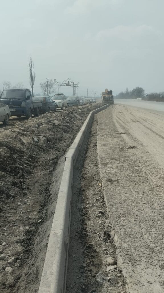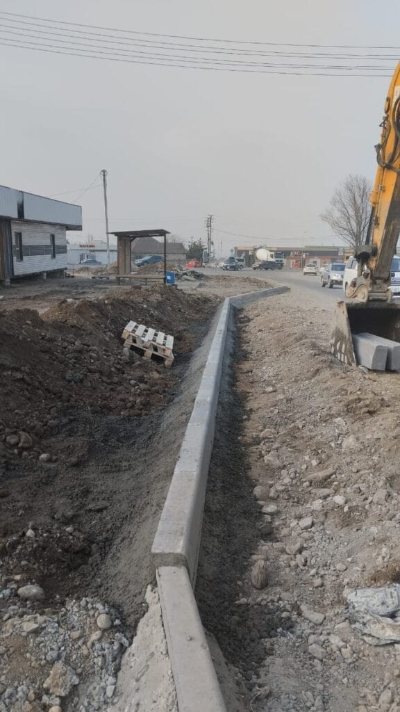 Работы ведут одновременно на нескольких участках. На отрезке 0–3.9 км дорожники устанавливают бордюры, а в селе Кунтуу готовят основания под асфальтирование тротуаров. Между селами Кунтуу и Токбай рабочие укрепляют дорожное основание, на участке до Кара-Сакала расчищают территорию с вырубкой деревьев.