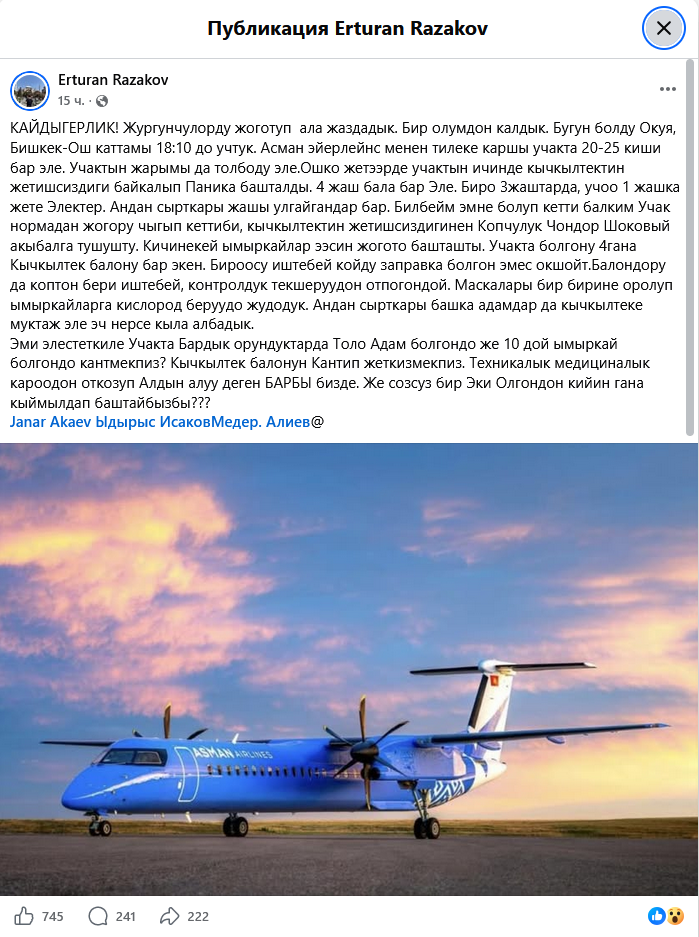 «Аэропорты Кыргызстана» прокомментировали нештатную ситуацию на борту самолета авиакомпании «Асман Эйрлайнс» на рейсе MN-15 Бишкек – Ош, произошедшую накануне, 16 апреля.