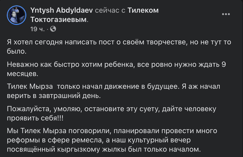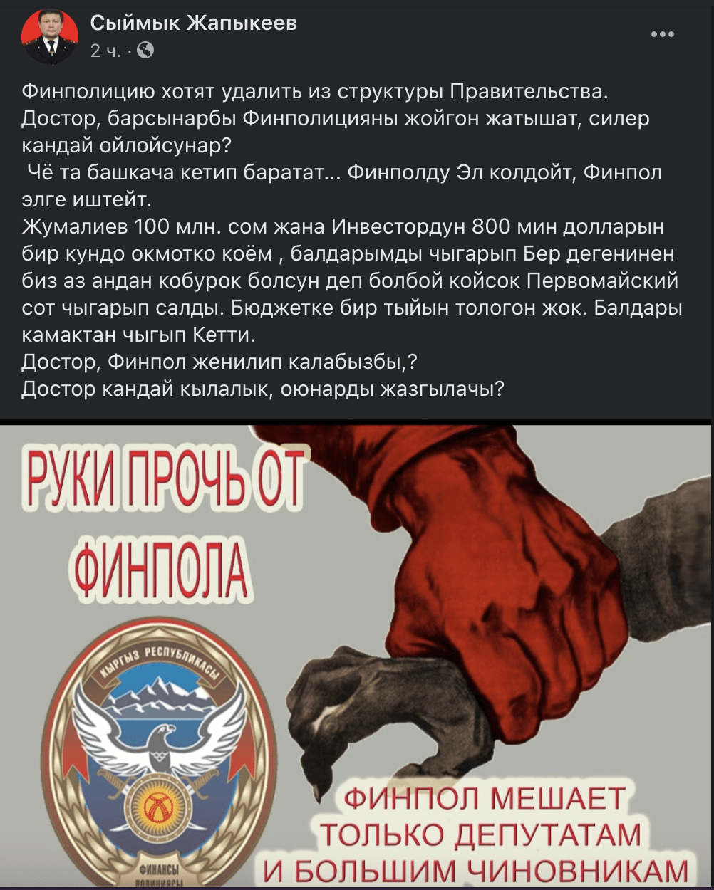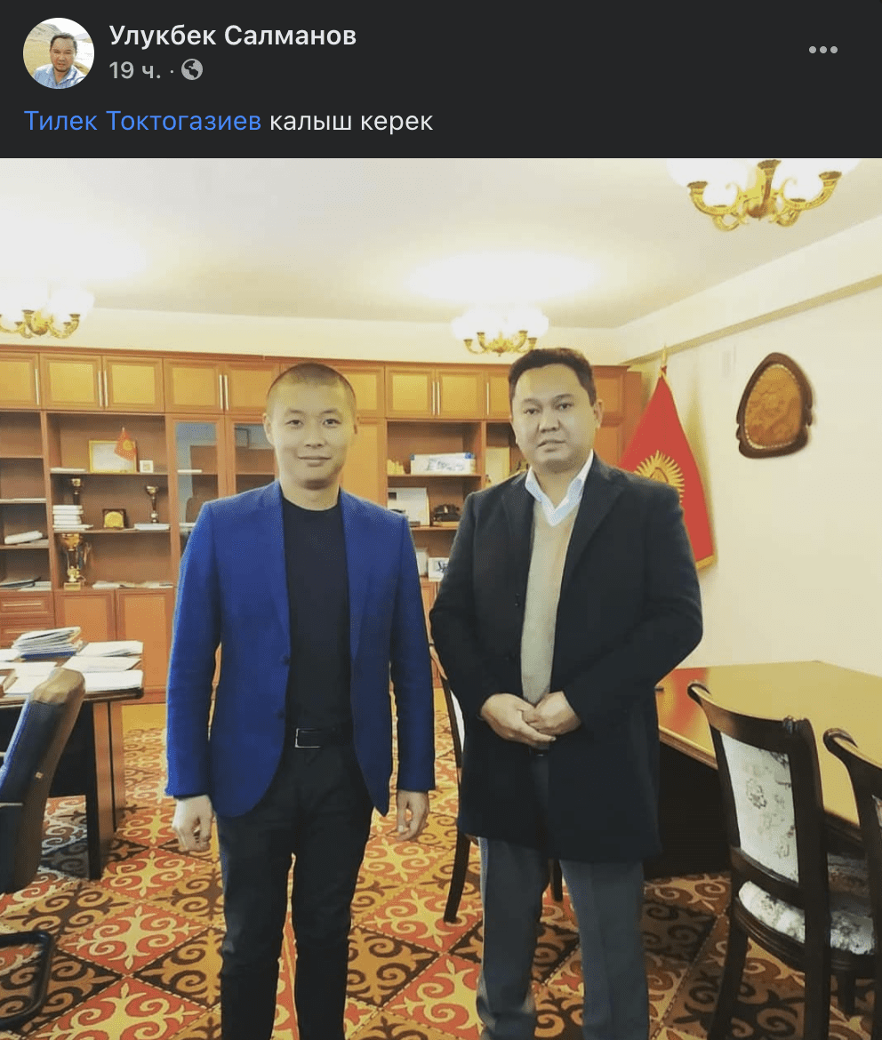«Жумалиев хотел за один день дать 100 млн сомов и $800 тысяч от инвестора, чтобы освободили его детей. Мы не согласились, хотели больше денег потребовать. Но Первомайский суд отпустил их. В бюджет не поступила ни одна копейка. Его дети вышли из-под стражи. Друзья, неужели Финпол сдастся? Как нам поступить, напишите свои мысли», — написал Жапыкеев на своей странице.