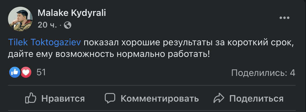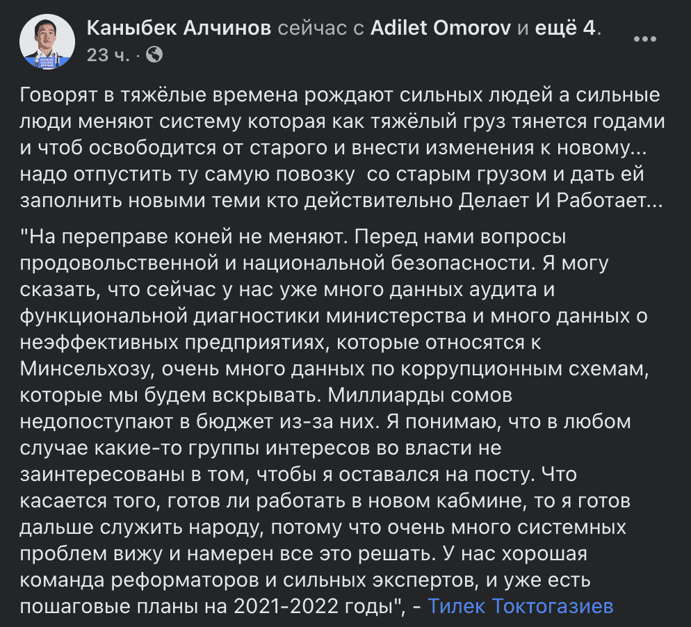 Остальные члены правительства пока не давали никакие комментарии, однако в соцсетях идет активная поддержка Тилека Токтогазиева с призывом оставить его на посту министра сельского хозяйства.