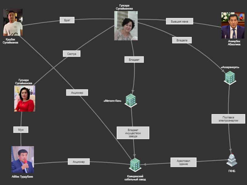 В частности, экс-супруга депутата Гулсара Сулайманова оказалась со-владелицей «Металл-Кена» вместе с китайской компанией, а муж ее сестры Айбек Турдубаев и брат Кушбак Сулайманов вошли в состав акционеров «Каиндинского кабельного завода».