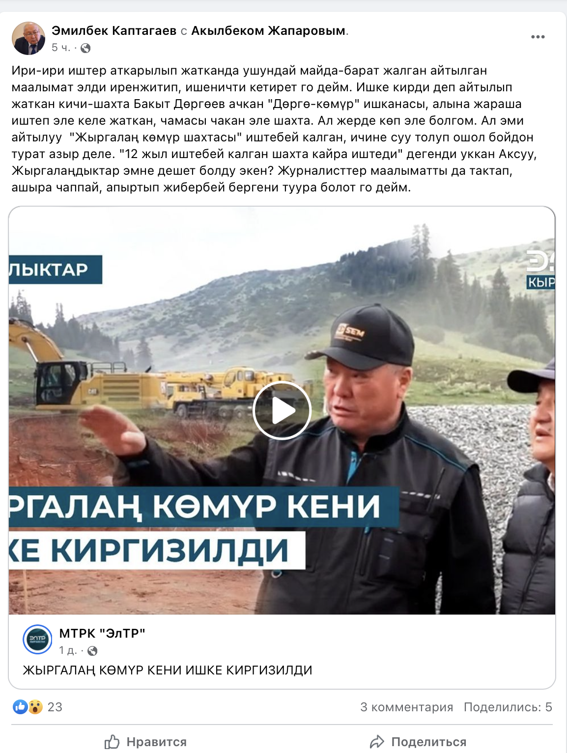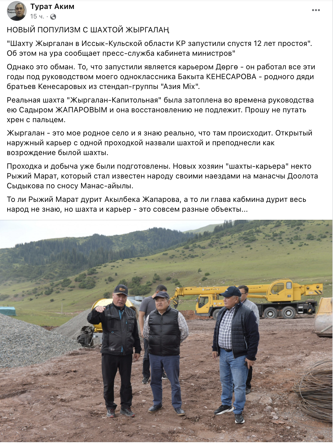 "То, что запустили, является карьером Дорго - он работал все эти годы под руководством моего одноклассника Бакыта Кенесарова - родного дяди братьев Кенесаровых из стендап-группы "Азия Мiх". Реальная шахта "Жыргалан-Капитольная" была затоплена во времена руководства ею Садыром Жапаровым и она восстановлению не подлежит. Прошу не путать хрен с пальцем", - написал он.