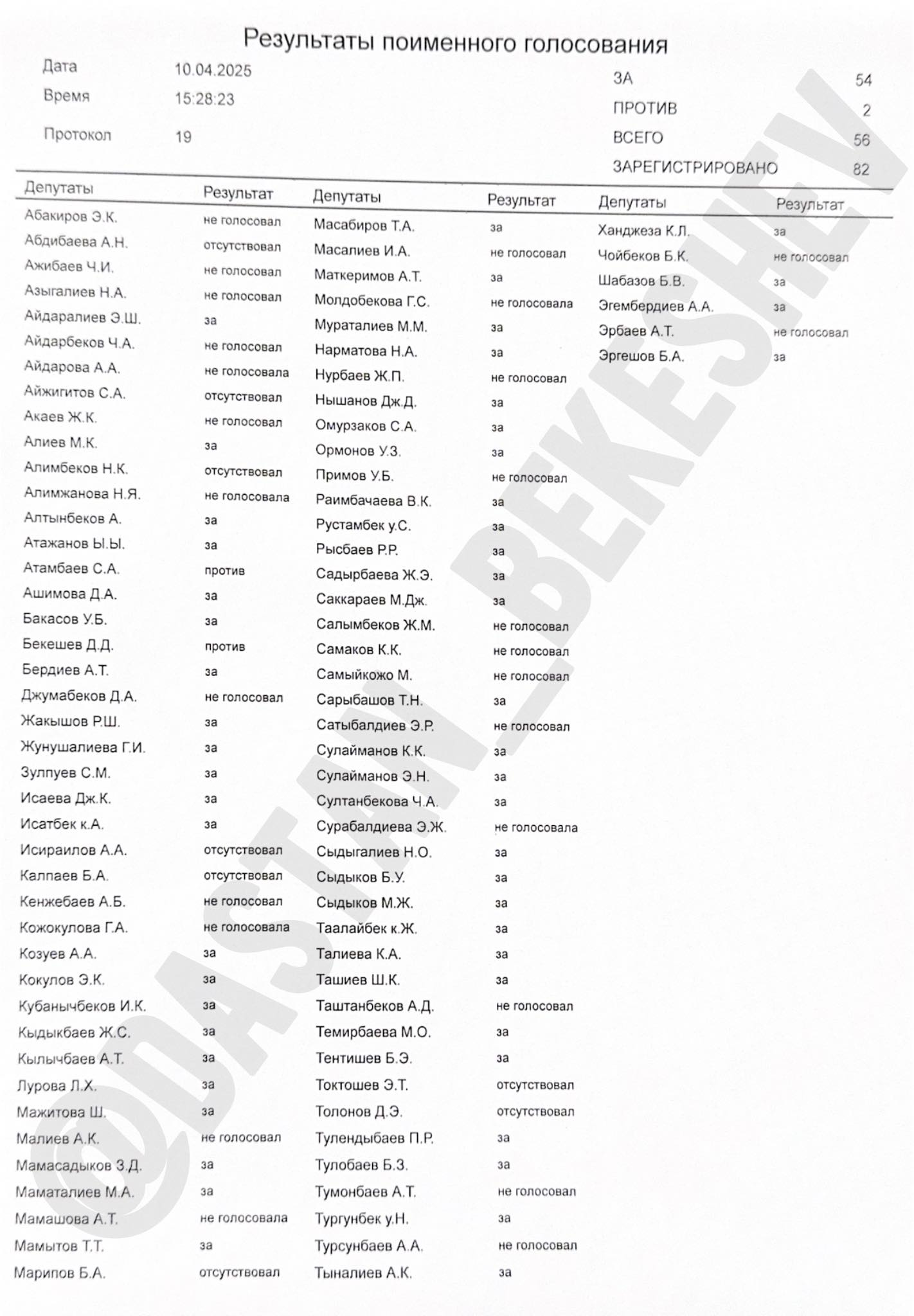 За документ проголосовали 54 депутата, против — Сеид Атамбаев и Дастан Бекешев, опубликовавший в соцсетях результаты голосования.