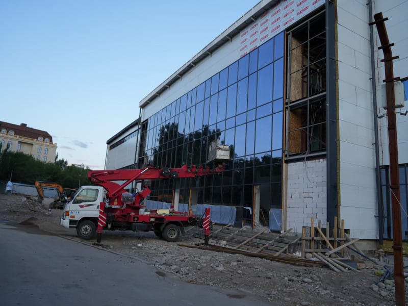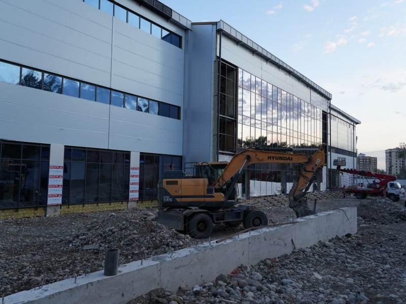 На данный момент ведутся монтаж сэндвич-панелей, прокладка внутренних инженерных сетей, отделочные работы на цокольном и первом этажах, установка перегородок из ГКЛ и облицовка санузлов плиткой.
