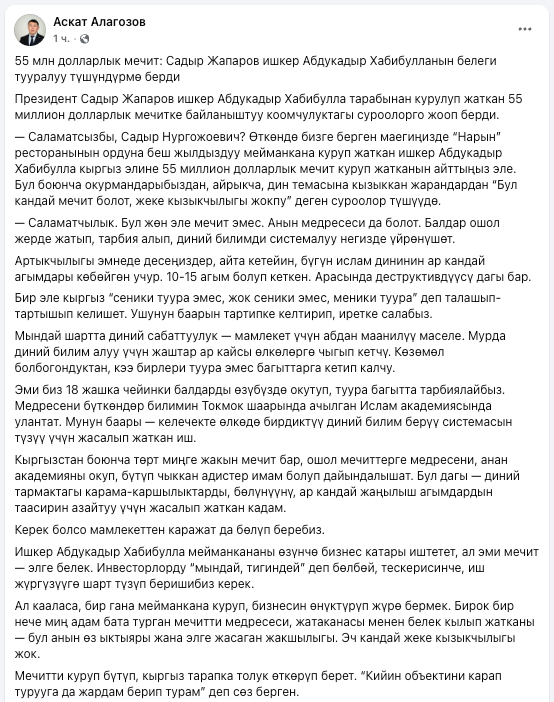 Президент Садыр Жапаров в интервью «Кабару» объяснил, почему предприниматель Хабибулла Абдукадыр строит мечеть стоимостью $55 млн. Об этом сообщил пресс-секретарь главы государства Аскат Алагозов, опубликовав полный текст беседы.