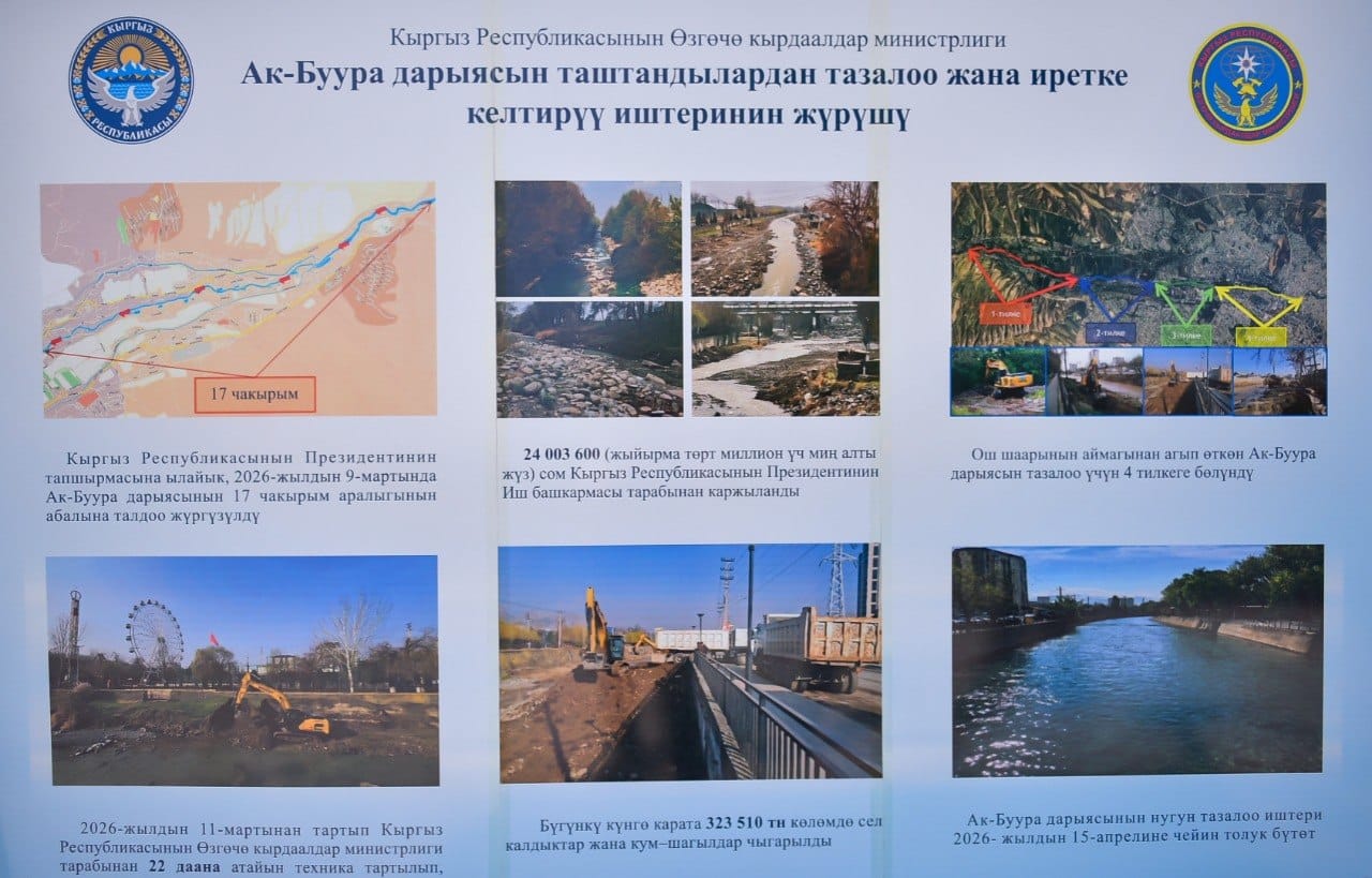В рамках поездки глава государства также изучил ход благоустройства реки Ак-Буура. Министр чрезвычайных ситуаций Канатбек Чыныбаев сообщил, что специалисты провели анализ состояния 17 км русла. На очистку выделили 24 млн сомов и привлекли 22 единицы спецтехники.