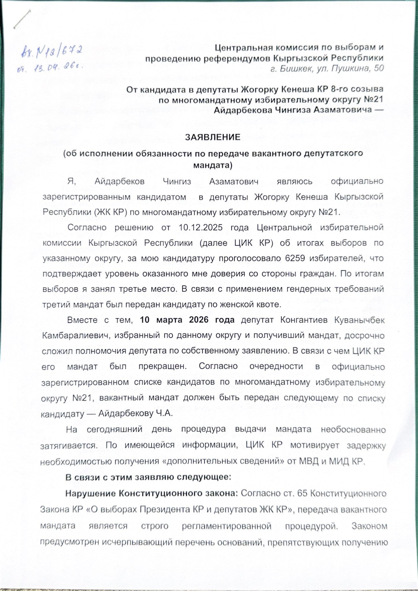 Чингиз Айдарбеков потребовал от ЦИК Кыргызстана выдать ему вакантный мандат депутата Жогорку Кенеша, соответствующее заявление кандидат направил в комиссию 3 апреля 2026 года. По словам политика, ведомство необоснованно затягивает процедуру передачи места в Жогорку Кенеше, ссылаясь на необходимость получения дополнительных сведений от МВД и МИД Кыргызстана.