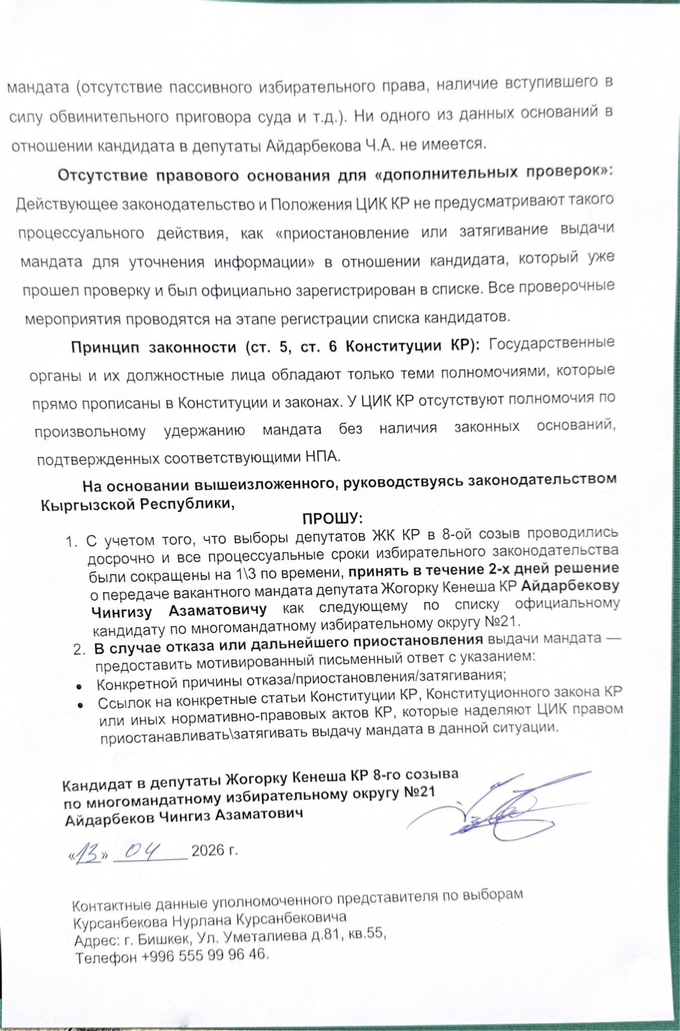 В обращении подчеркивают, что действия Центризбиркома нарушают статью 65 Конституционного закона «О выборах». Айдарбеков указывает: законодательство не предусматривает «дополнительных проверок» или приостановки выдачи мандата для кандидатов, которые уже прошли регистрацию и включены в официальные списки.
